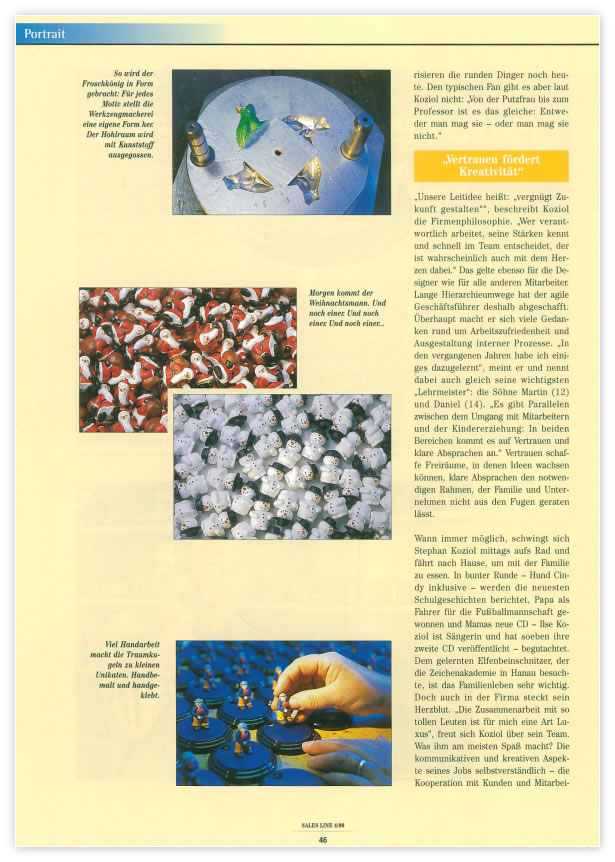 Wann immer möglich, schwingt sich Stephan Koziol mittags aufs Rad und fährt nach Hause, um mit der Familie zu essen. In bunter Runde – Hund Cindy inklusive – werden die neuesten Schulgeschichten berichtet, Papa als Fahrer für die Fußballmannschaft gewonnen und Mamas neue CD – Ilse Koziol ist Sängerin und hat soeben ihre zweite CD veröffentlicht – begutachtet. Dem gelernten Elfenbeinschnitzer, der die Zeichenakademie in Hanau besuchte, ist das Familienleben sehr wichtig. Doch auch in der Firma steckt sein Herzblut. " Die Zusammenarbeit mit so tollen Leuten ist für mich eine Art Luxus", freut sich Koziol über sein Team. |